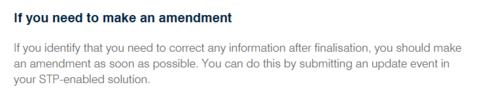 I've successfully submitted my Final Event to Gov Connect. However, I needed to make adjustments to one of our employees pays, so I sent an update event with only that employee details. There is now an Error message sent from ATO because the date posted over in 'Employee Payments' is the present date that the file was made and therefore in the incorrect payroll year.