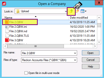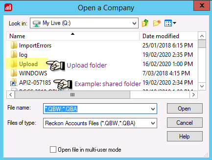 4. When prompted with the Open a Company dialog window, you will need to locate the data file which is located in the Q:\Upload by navigating inside the folder (double-click on the Upload folder)