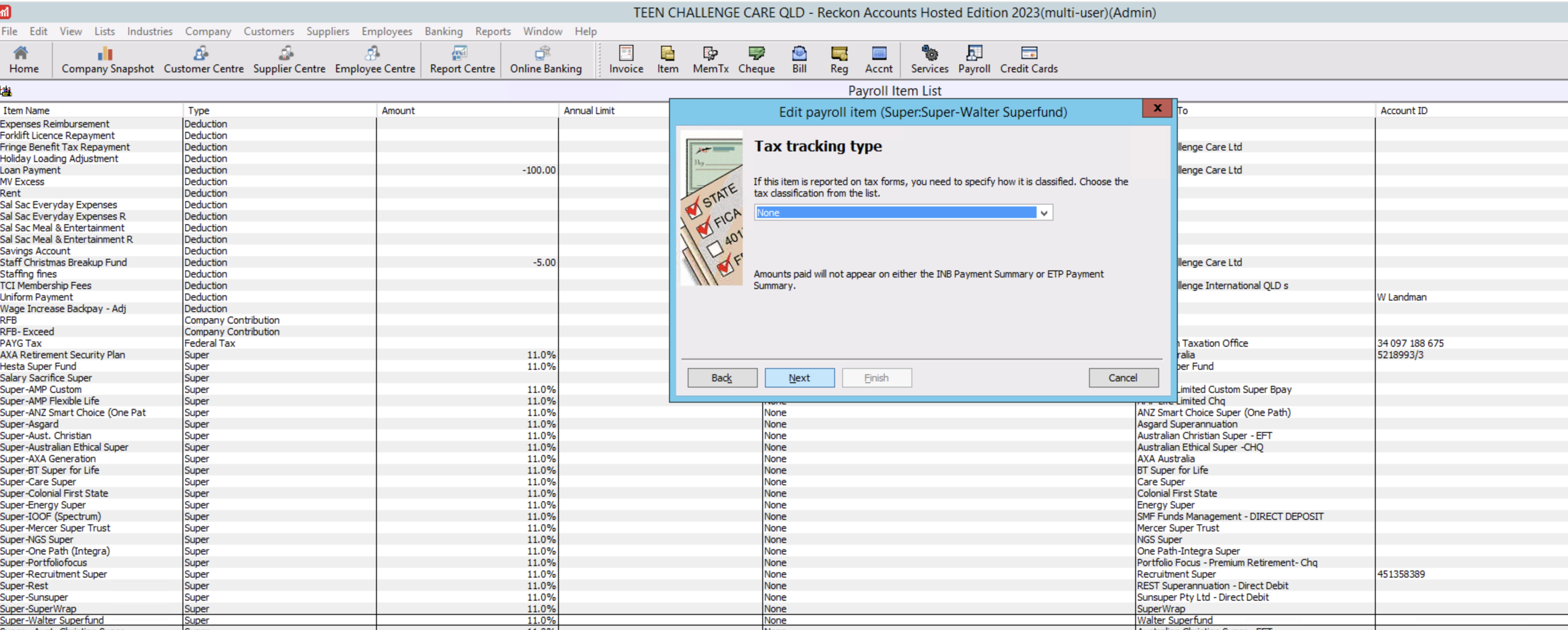 On another note, your financials must be ridiculously long! Best practice is to create ONE Super Payroll Item per Fund, per Super type eg