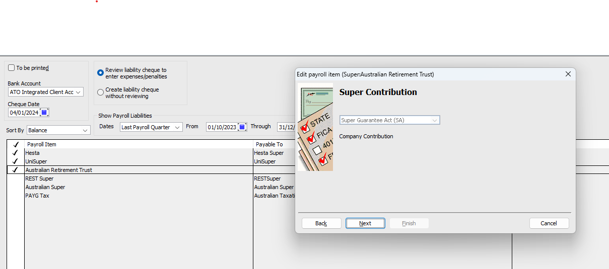 I tried to process super payment. Every time I selected the new employee. It showed Payroll Item no likability agency.